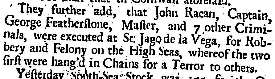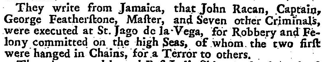 John Racan, Captain, George Featherstone, Master, and Seven other Criminals, were executed at St. Jago de la Vega, for Robbery and Felony committed on the high Seas, of whom the two first were hanged in Chains, for a Terror to others.