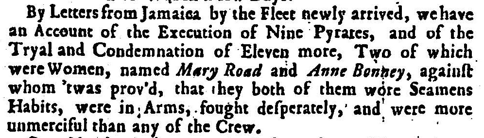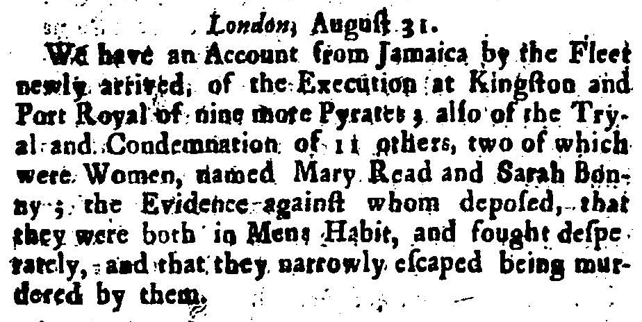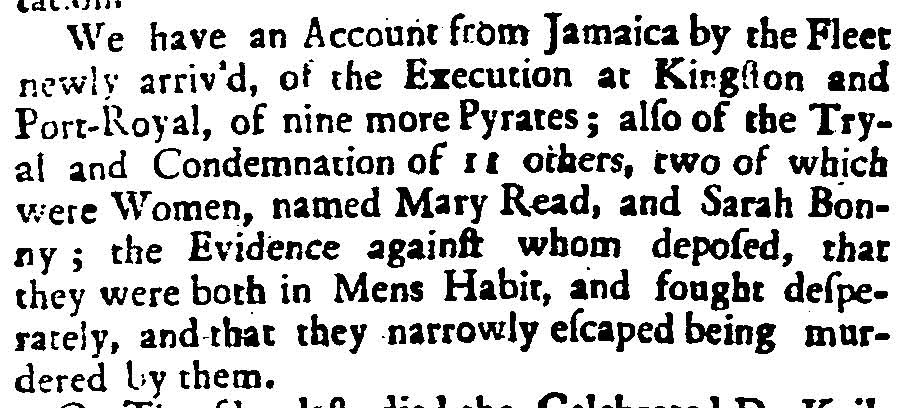 the Execution at Kingston and Port Royal of nine more Pyrates; also of the Tryal and Condemnation of 11 others, two of which were Women, named Mary Read and Sarah Bonny; the Evidence against whom deposed, that they were both in Mens Habit, and fought desperately, and that they narrowly escaped being murdered by them.
