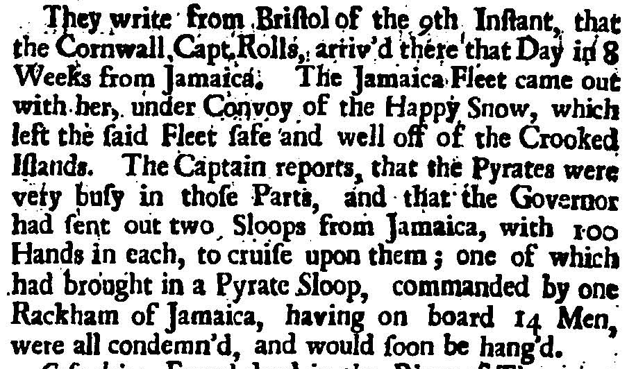 the Pyrates were very busy in those Parts, and that the Governor had sent out two Sloops from Jamaica, with 100 Hands in each, to cruise upon them; one of which had brought in a Pyrate Sloop, commanded by one Rackham of Jamaica, having on board 14 Men, were all condemn’d, and would soon be hang’d.