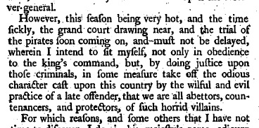 the grand court drawing near, and the trial of the pirates soon coming on, and must not be delayed, wherein I intend to sit myself, not only in obedience to the king’s command, but, by doing justice upon those criminals, in some measure take off the odious character cast upon this country by the wilful and evil practice of a late offender, that we are all abettors, countenancers, and protectors, of such horrid villains.