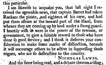 A motion being made, that captain Barnet be considered for the good service done the island in taking the pirate; Resolved, That, in consideration of the good services performed by captain Jonathan Barnet and his company, in taking John Rackam and his crew, noted pirates, the said Jonathan Barnet and his company shall have and receive, as a reward for such service, two hundred pounds; one hundred pounds for the said captain, and the other hundred pounds to be divided among his sloop’s company